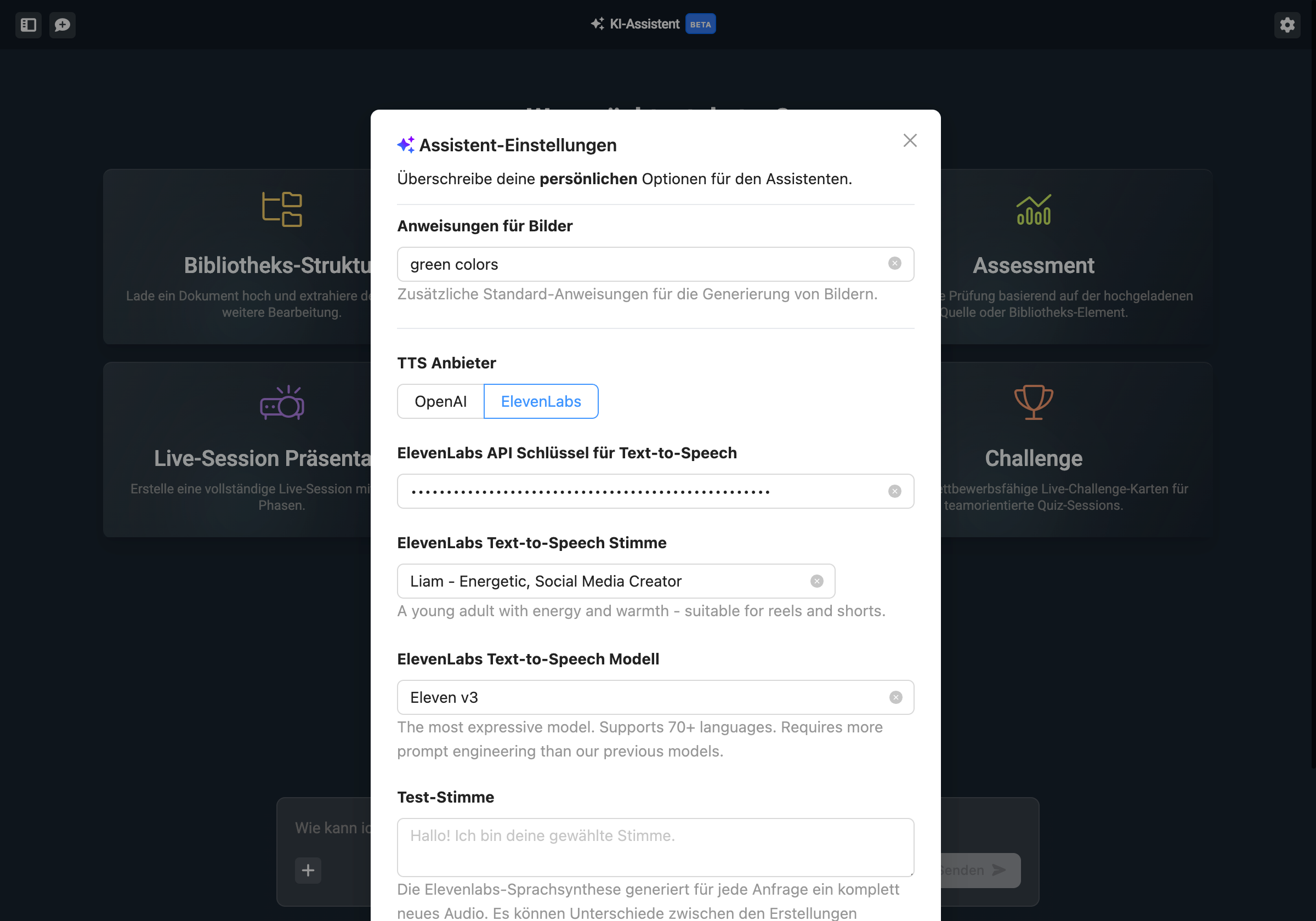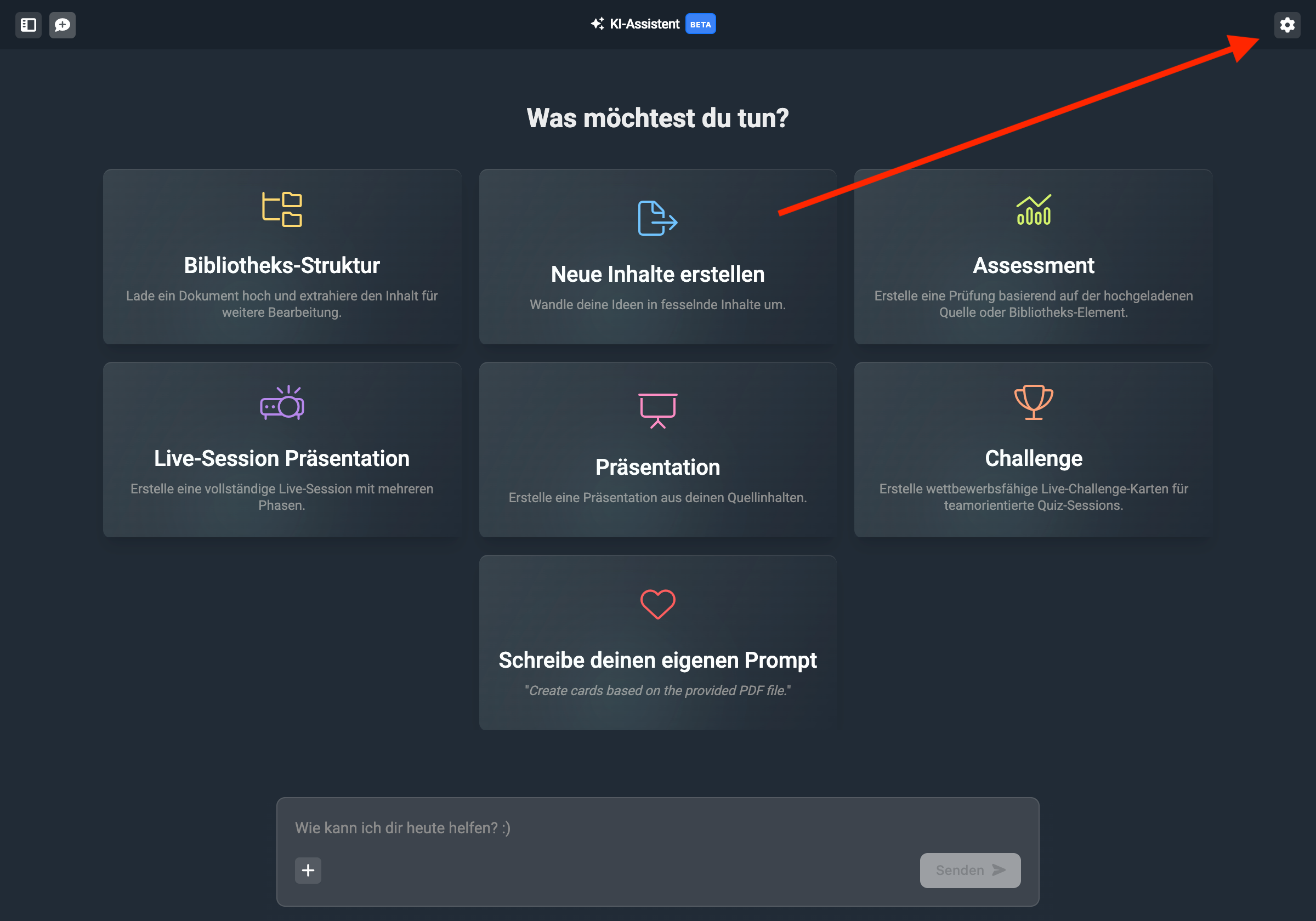 Du kannst für den KI-Assistenten eigene Einstellungen für die Generierung von Bildern und Voice Overs wählen. Klicke dazu auf das Zahnrad rechts oben im KI-Assistenten Fenster.