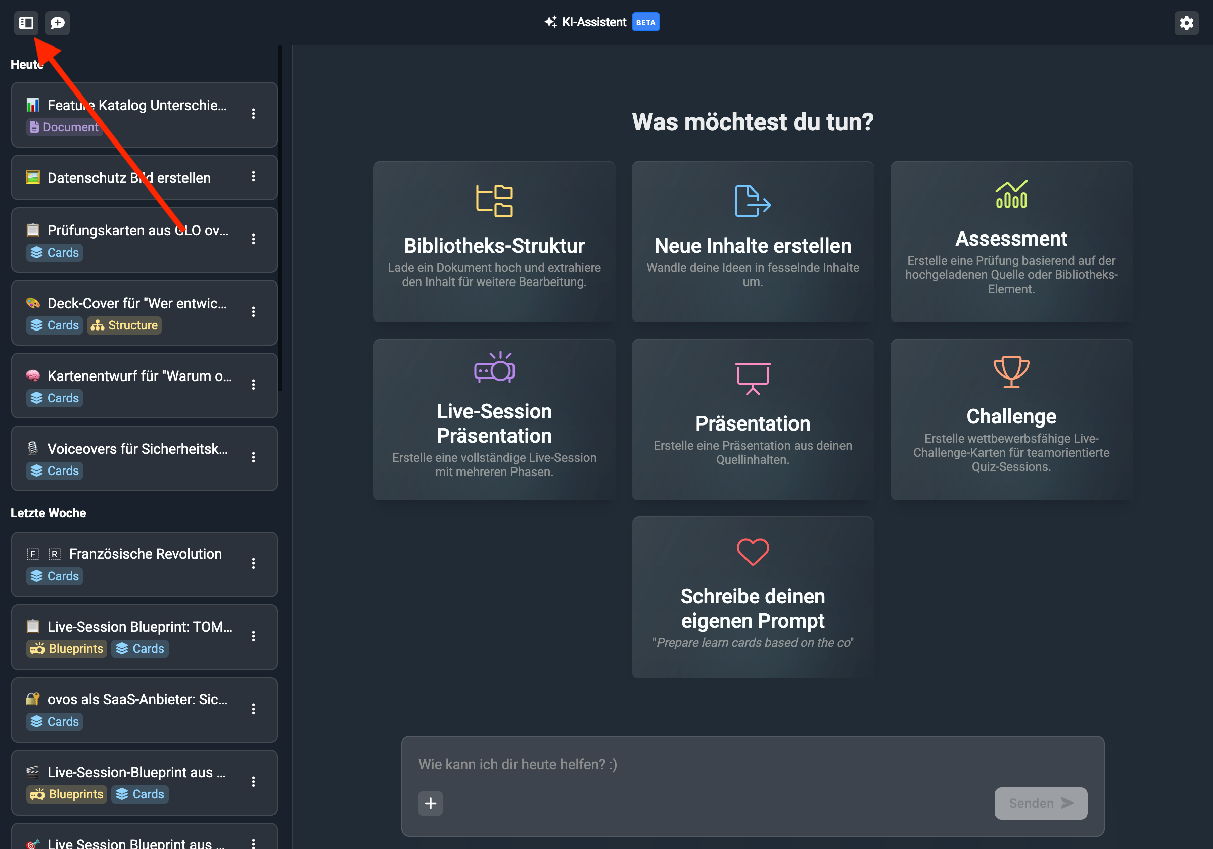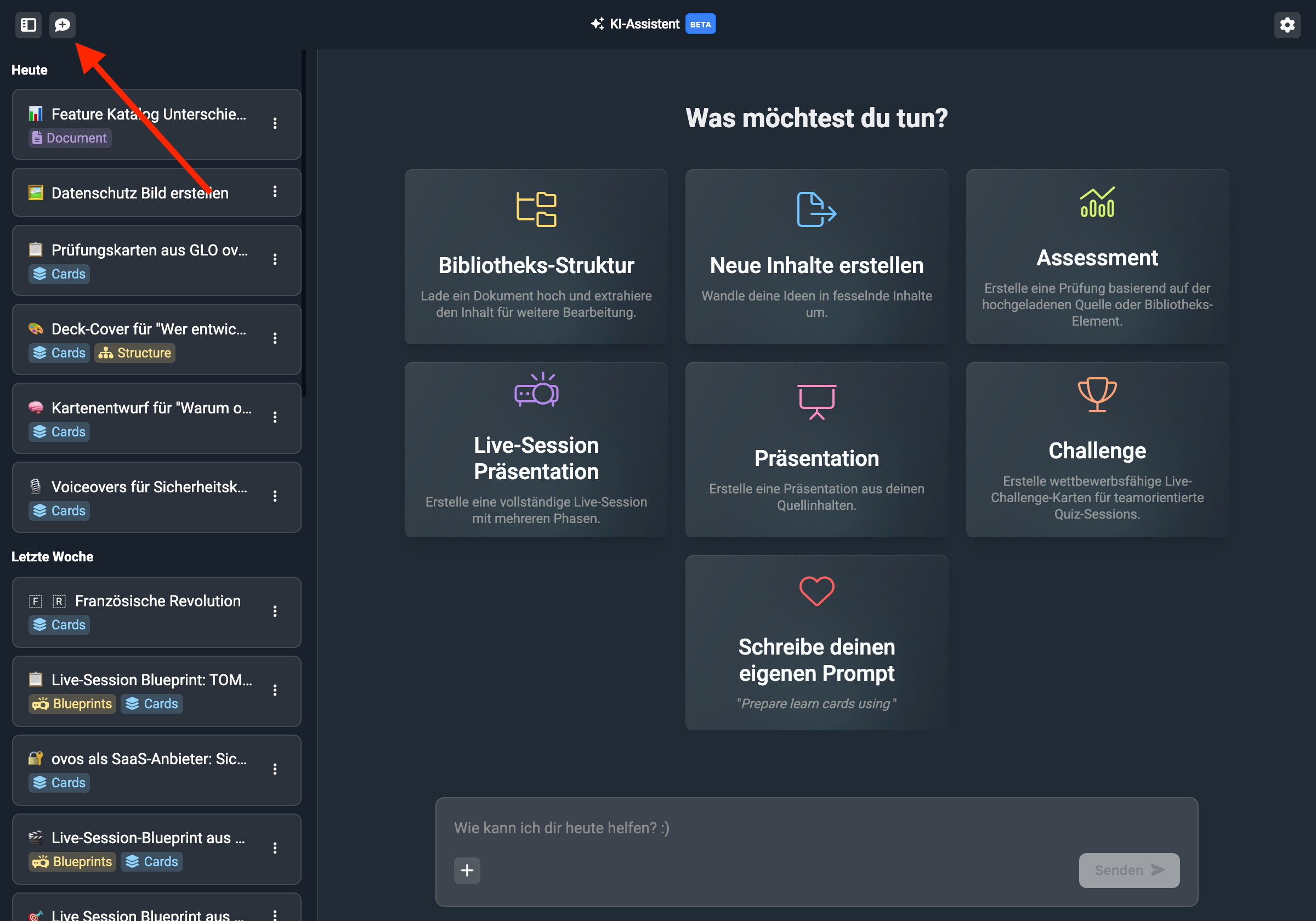 Der KI-Assistent erstellt immer neue und getrennte Konversationen. Jede Konversation hat dann ihren eigenen Kontext (hochgeladene Quellen, Anfragen, etc.).