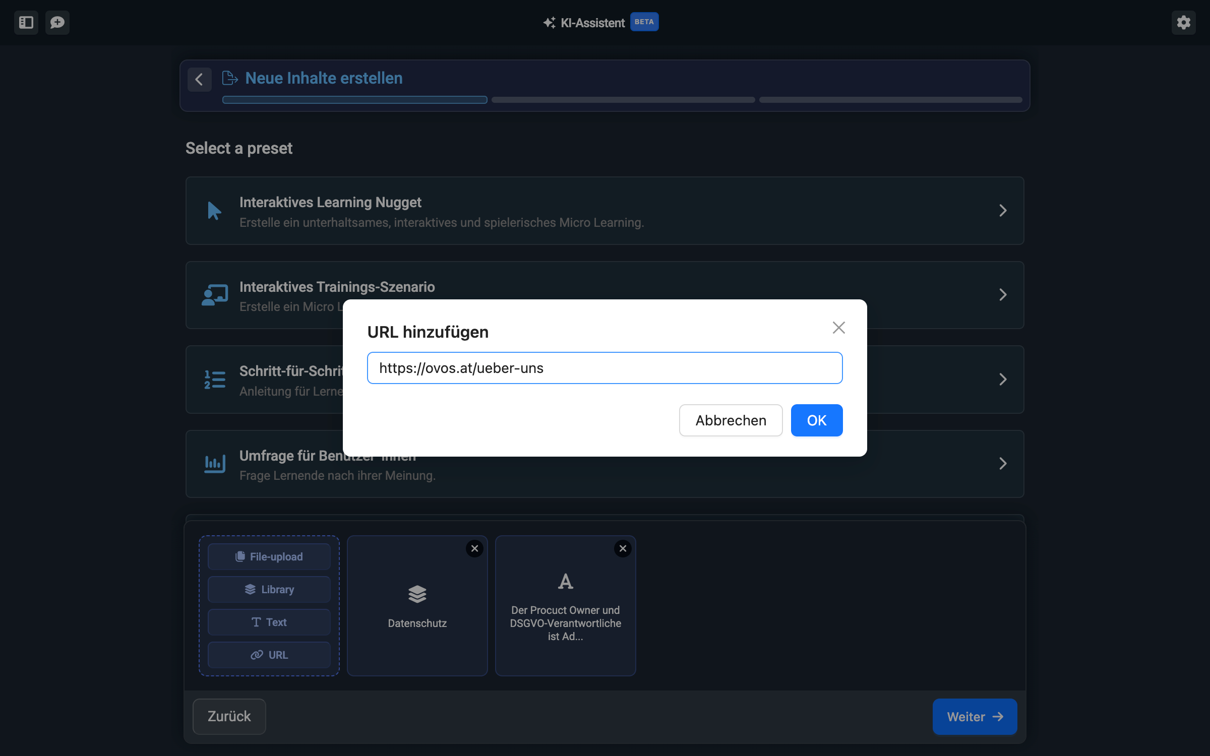 Du kannst auch eine Webseite als Quelle definieren. Wähle dazu “URL” und kopiere einfach den Weblink in das Input-Feld. Die KI sieht sich dann die Webseite an und verwendet die Texte der Webseite.