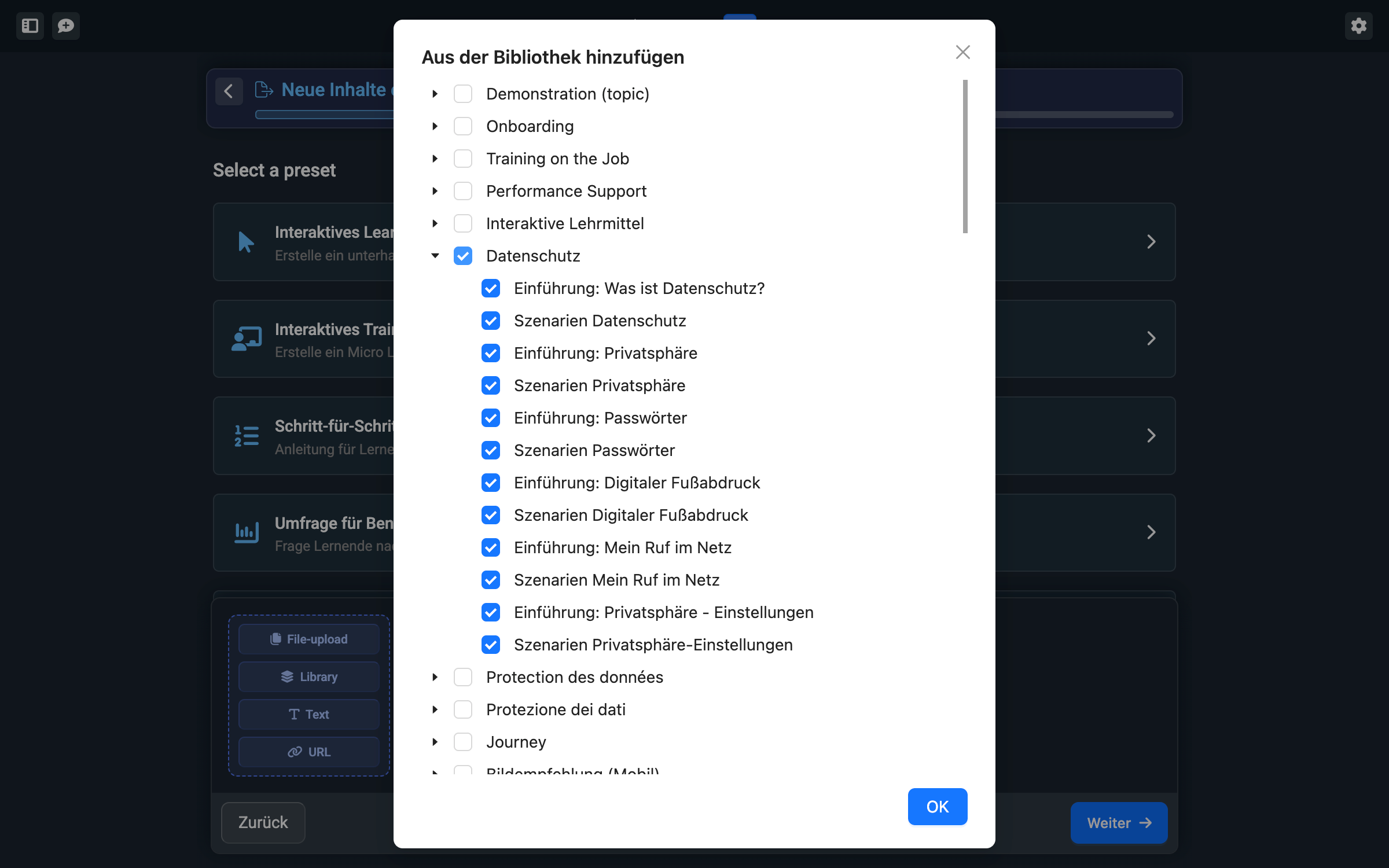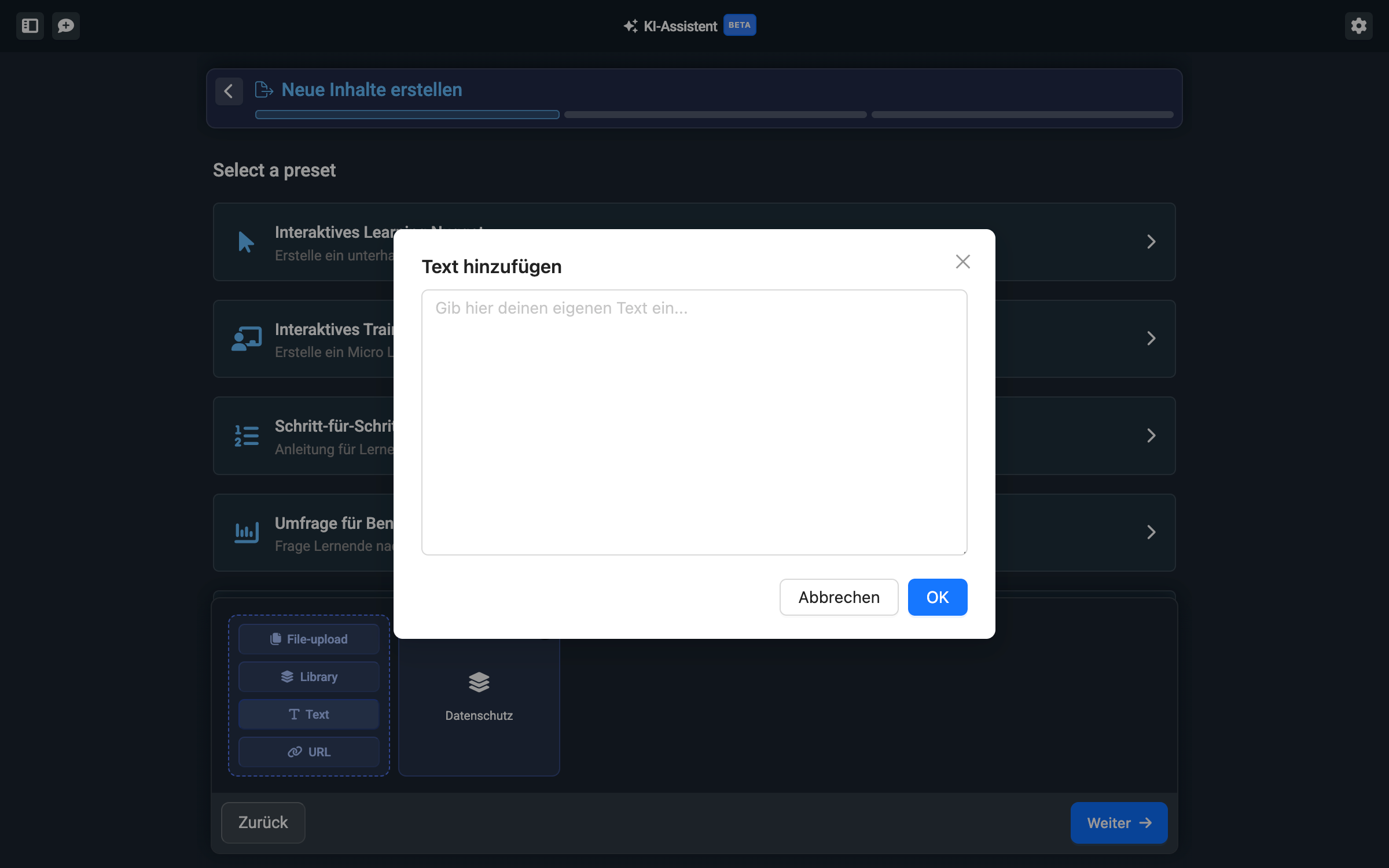 Für die Anleitung machen wir ein Beispiel eines Decks mit einem Interaktiven Learning Nugget. Im nächsten Teilschritt kannst du die Struktur noch genauer anpassen.