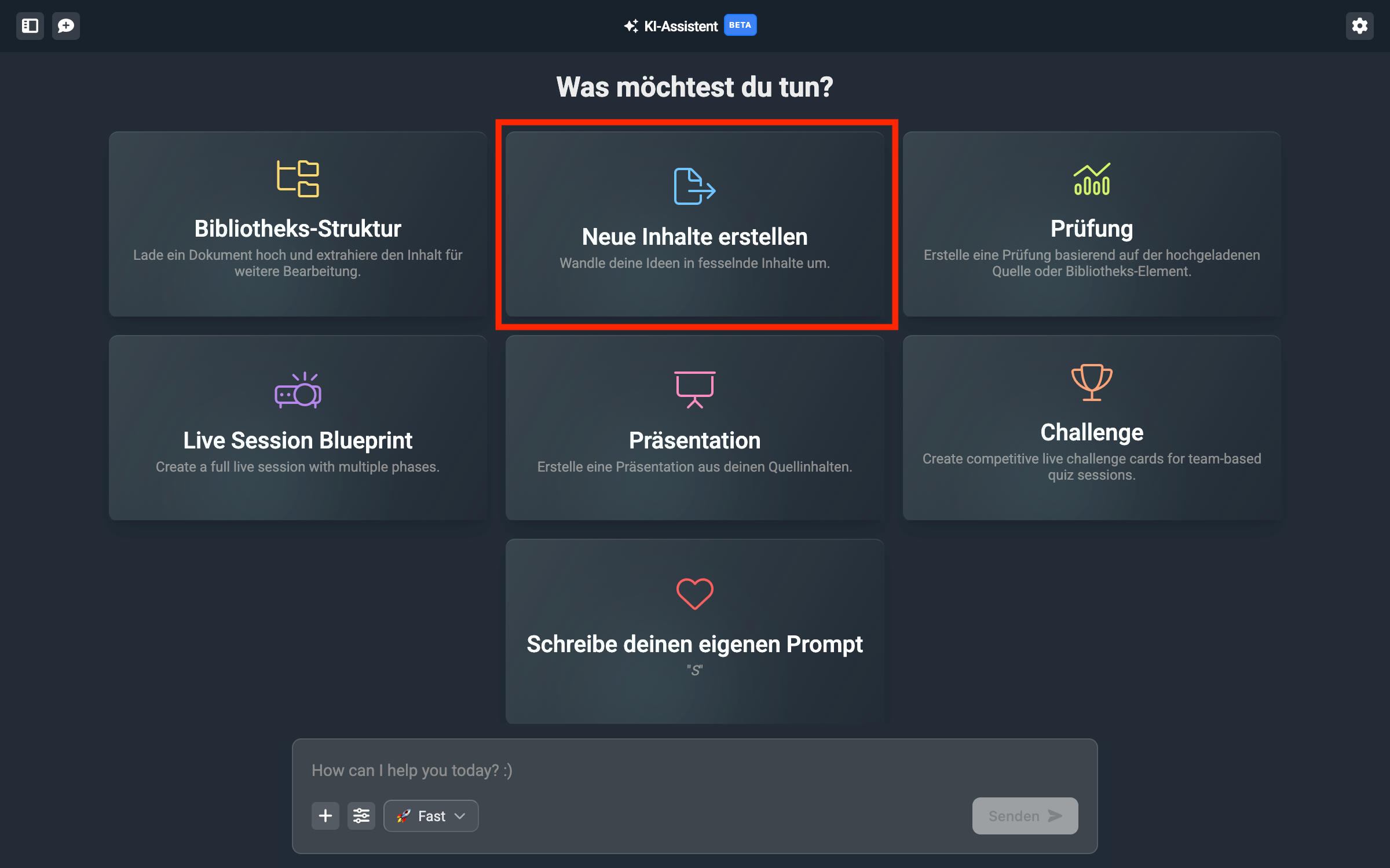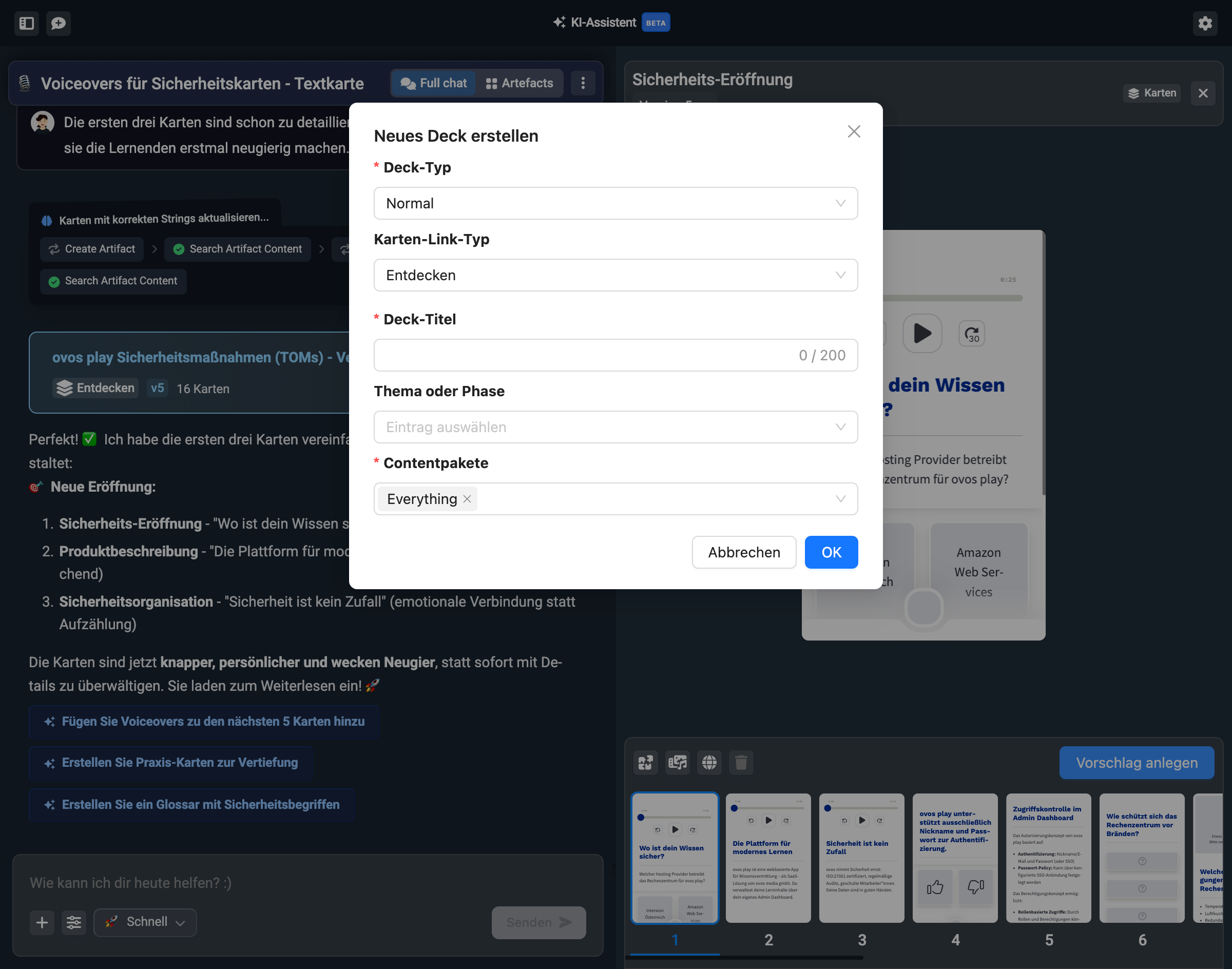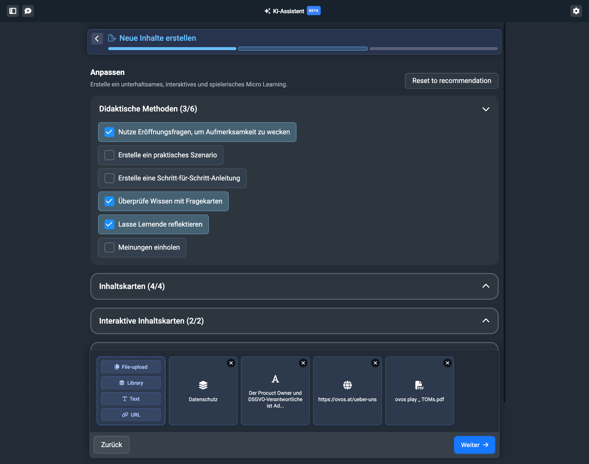 Mit dem Inhalte-Modus bekommst du einen Vorschlag für ein einzelnes Deck. Der Vorschlag beinhaltet eine Lernstrecke aus Lernkarten den Entdecken- oder Üben-Teil. Der Assistent kennt dabei mehrere didaktische Strukturierungen für die Inhalte.