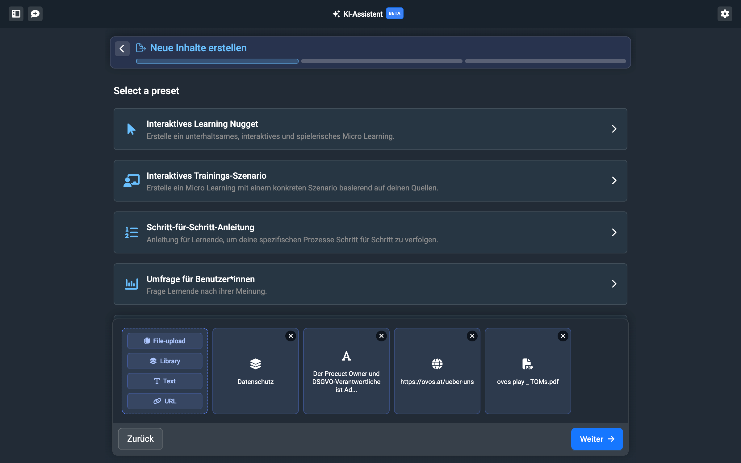Du kannst mehrere Quellen aus allen verfügbaren Typen hinzufügen. Damit kannst du z. B. bestehende Bibliotheksinhalte mit weiteren PDFs anreichern. Deine hinzugefügten Quellen hast du unten bei jedem Schritt immer im Blick: