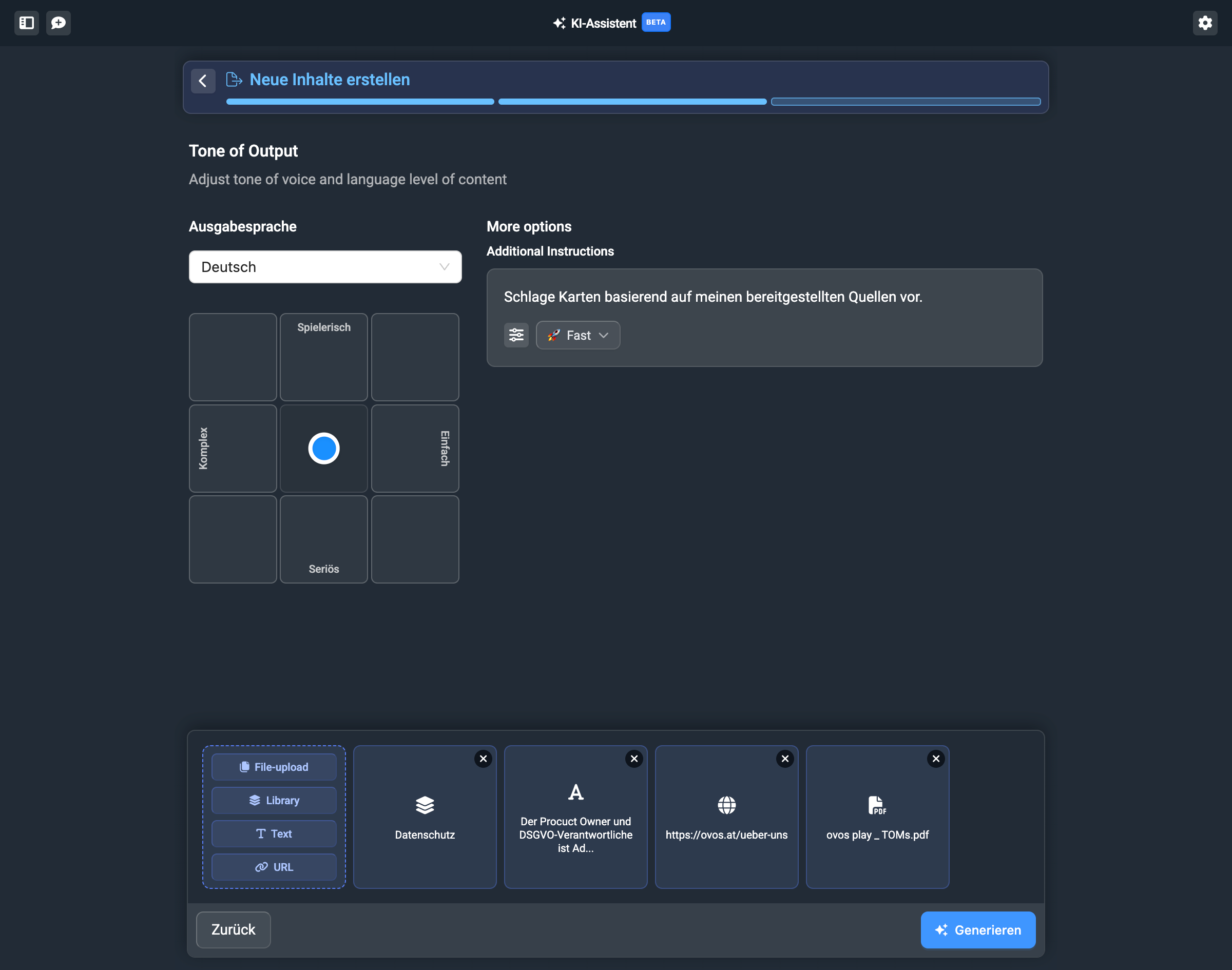 Mit dem Auswahlfeld auf der linken Seite bestimmst du von links nach rechts, ob die Inhalte sehr komplex oder einfach formuliert werden. Von unten nach oben bestimmst du, ob die Texte sehr seriös oder spielerisch gestaltet werden sollen.