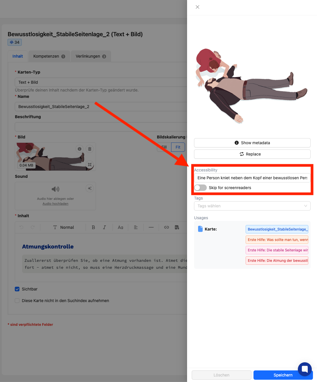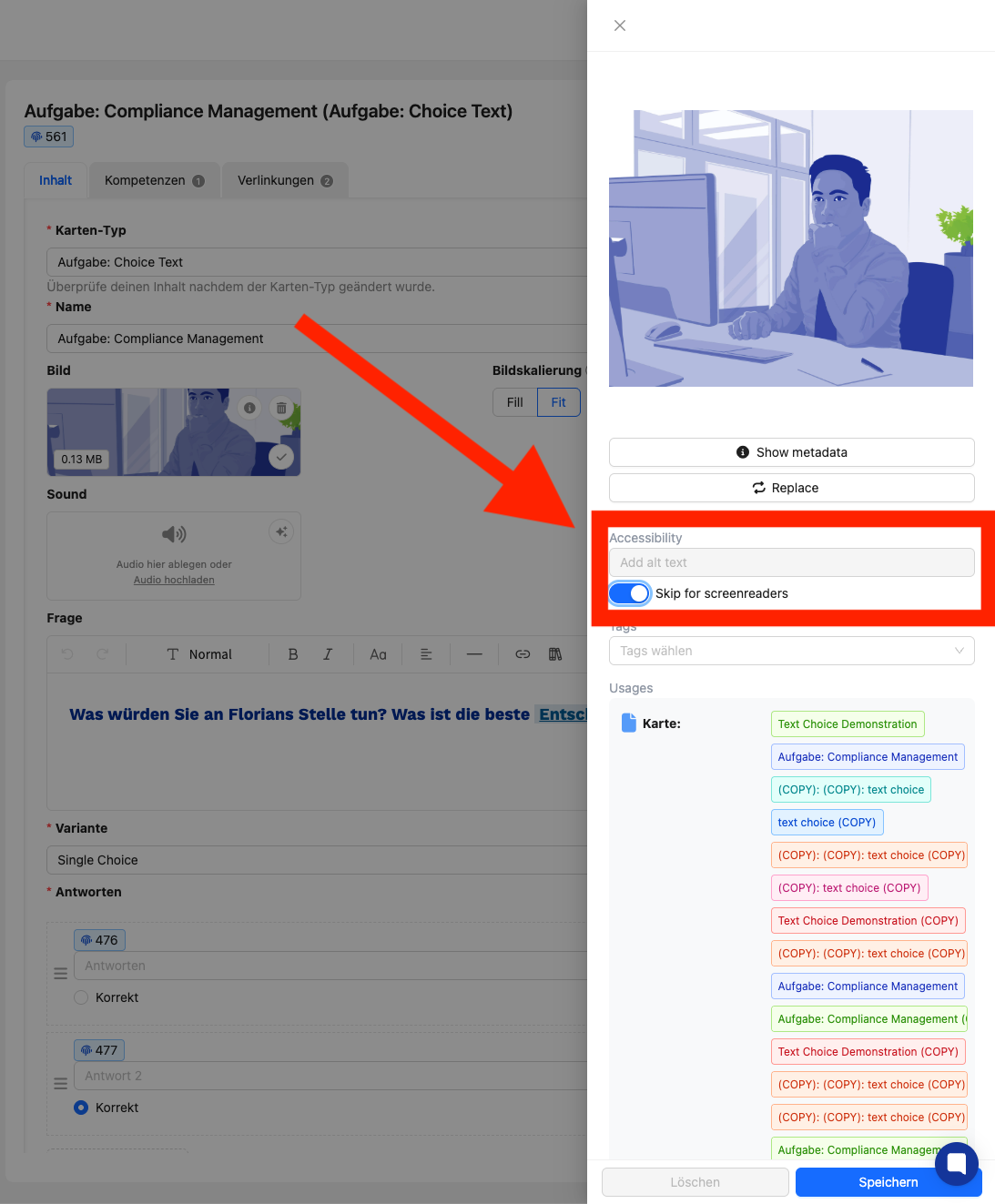 Wenn dein Bild nur einen ästhetischen oder dekorativen Zweck hat und keinen Mehrwert für die textliche Information bietet, dann kannst du den Alternativtext für Screenreader auch überspringen. Das sorgt für ein besseres Erlebnis und der Screenreader beginnt direkt den Inhalt der Lernkarte zu lesen.