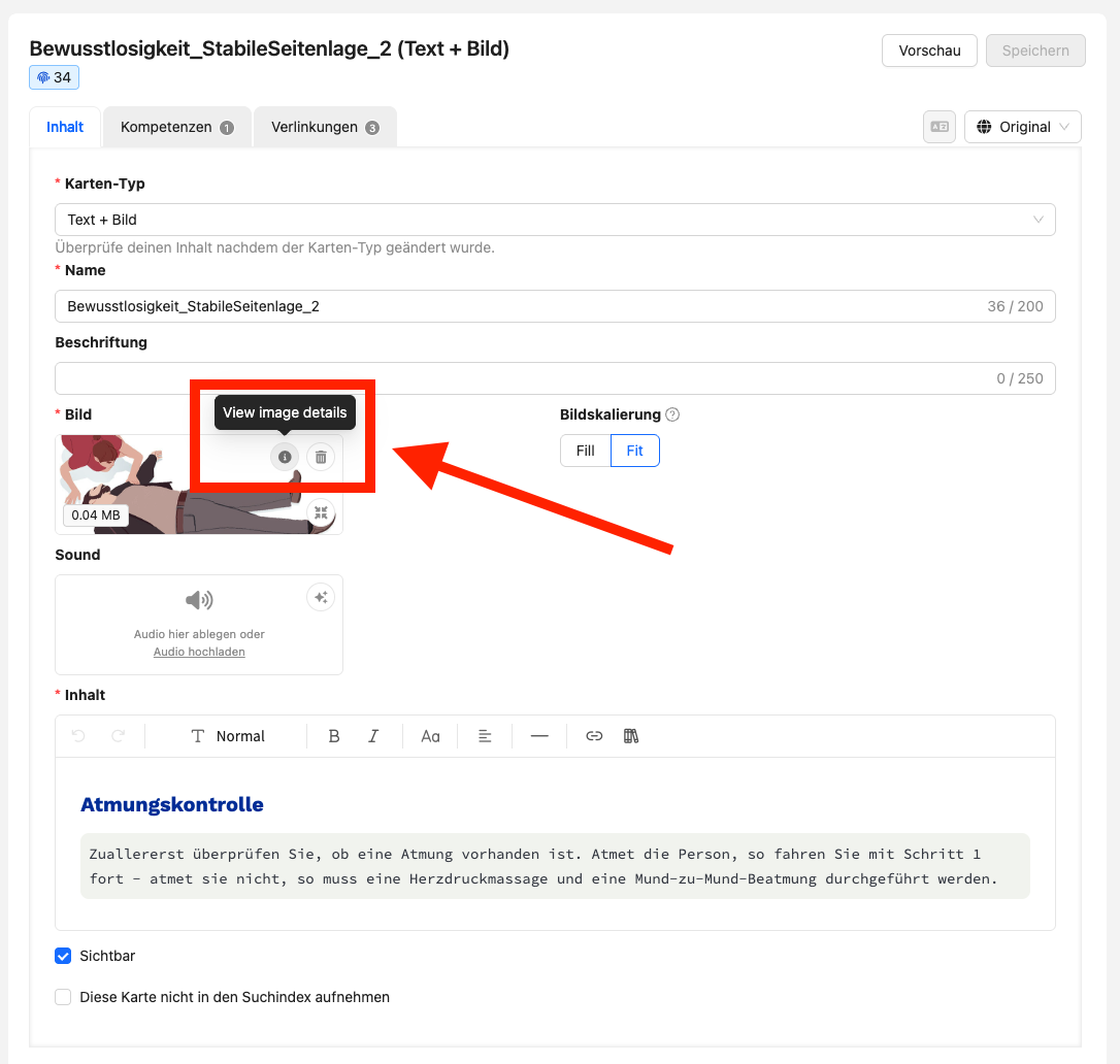 Wenn du Bilder zu Lerninhalten hinzufügst, dann findest du am Bild einen Info-Button, um die weiteren Daten des Bildes einzusehen.