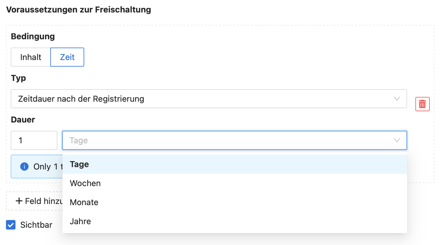 Hinweis: Es können beliebig viele inhaltsbasierte Freischalte-Bedingungen hinzugefügt werden, aber nur eine zeitliche Bedingung.